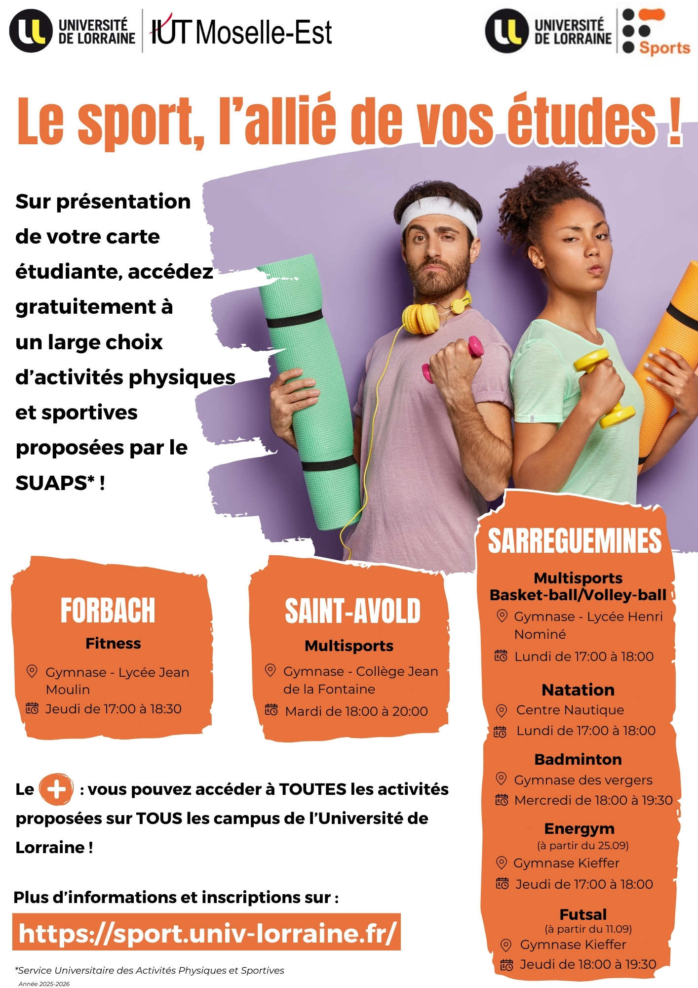 Lorsque vous êtes étudiant.e à l'IUT de Moselle-Est vous accédez gratuitement à un large choix d’activités physiques et sportives proposées par le SUAPS*, le Service Universitaire des Activités Physiques et Sportives de l'Université de Lorraine.
