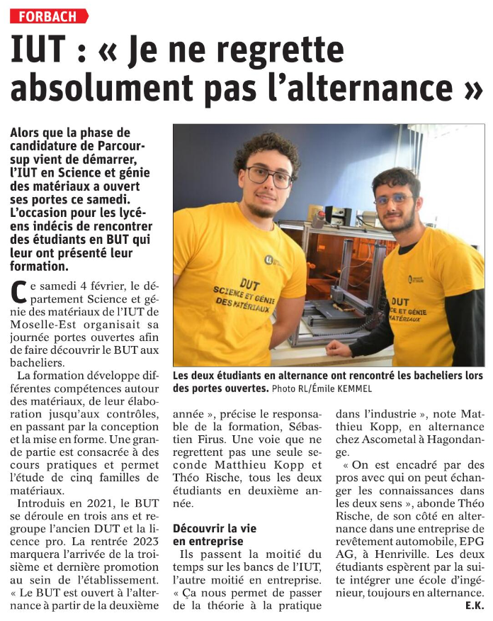Une partie de la formation du BUT Science et Génie des Matériaux pourra être effectuée en apprentissage pour les étudiants volontaires. Le programme de la formation est le même que celui de la formation classique avec plusieurs périodes plus ou moins longues au sein d’une société ou d’un laboratoire partenaire.